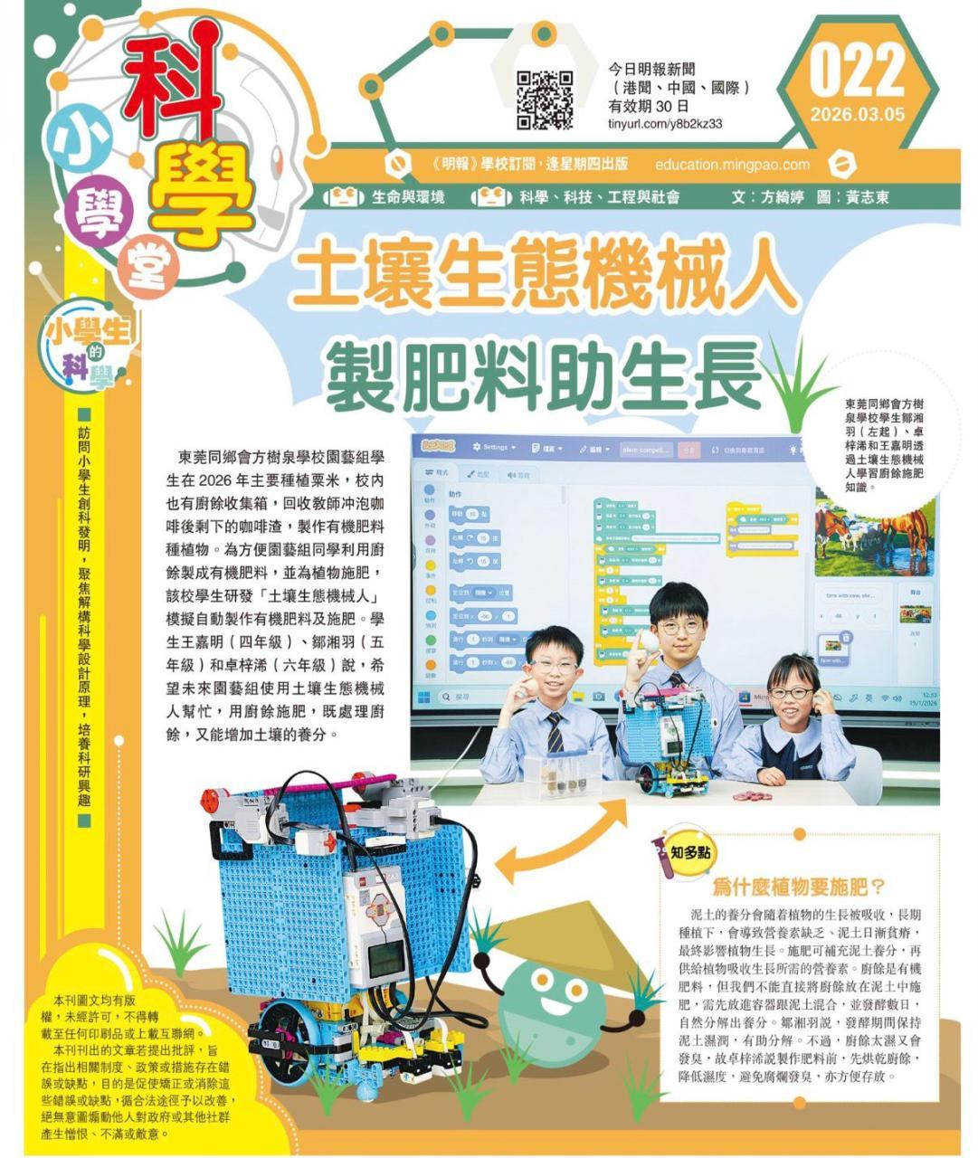 Earlier, three of our students were featured in an exclusive interview with Ming Pao’s "Science Academy" to share the achievements and insights from their scientific inquiry project — the "Soil Ecology Robot."