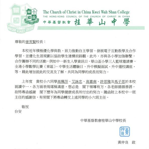 近日本校收到多間中學來函,分享我校畢業生在中學階段的優異表現,令人欣喜!其中王幼凡同學更於伊利沙伯中學考獲中一級第三名的佳績,成績斐然,值得嘉許。