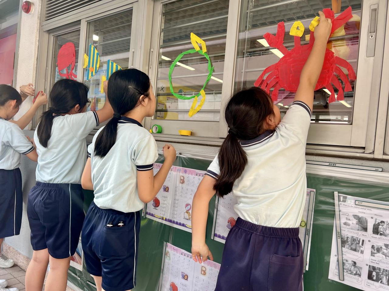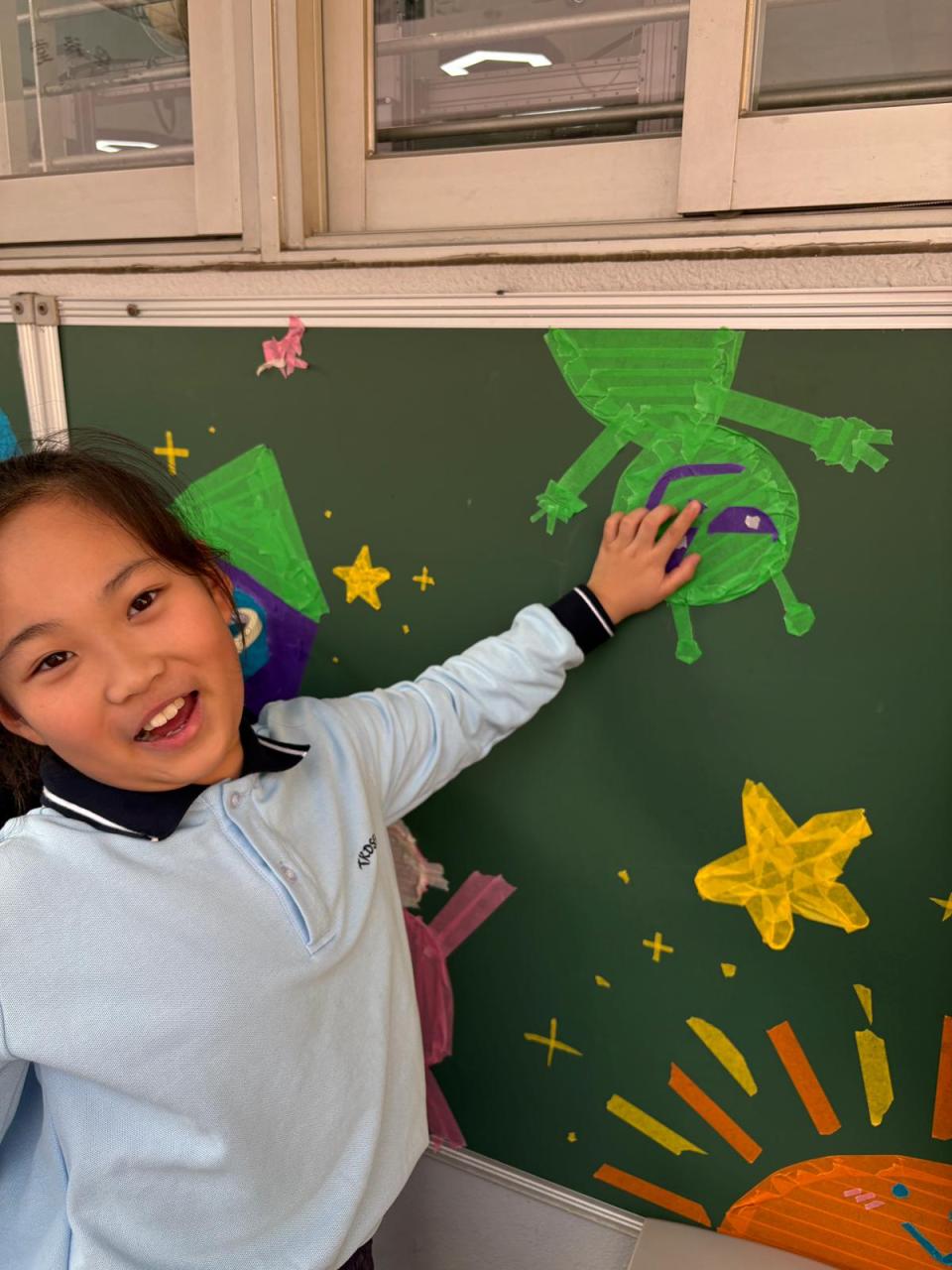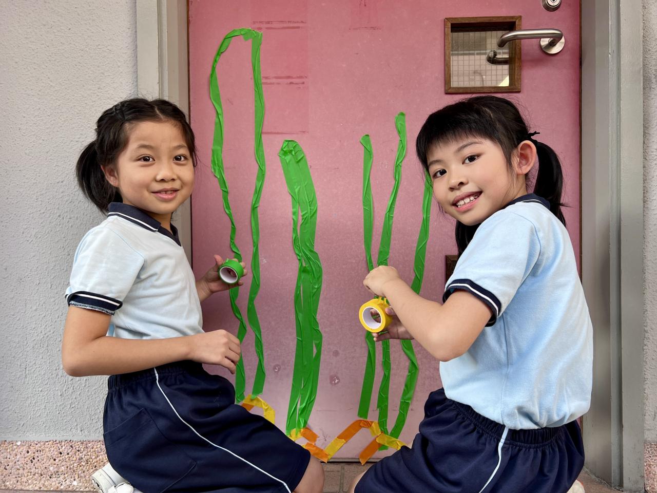 藝創隊運用日常可見的彩色膠紙作為畫筆,讓牆面與窗戶變身為創意畫布。他們自由拼貼、盡情創作,將膠紙化作各式圖案,不僅呼應教室主題,更將校園變成繽紛的創意天地!