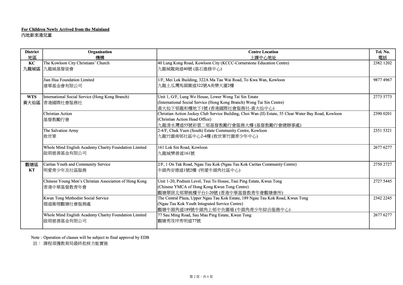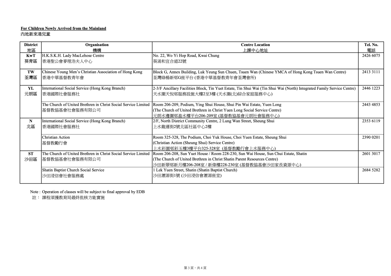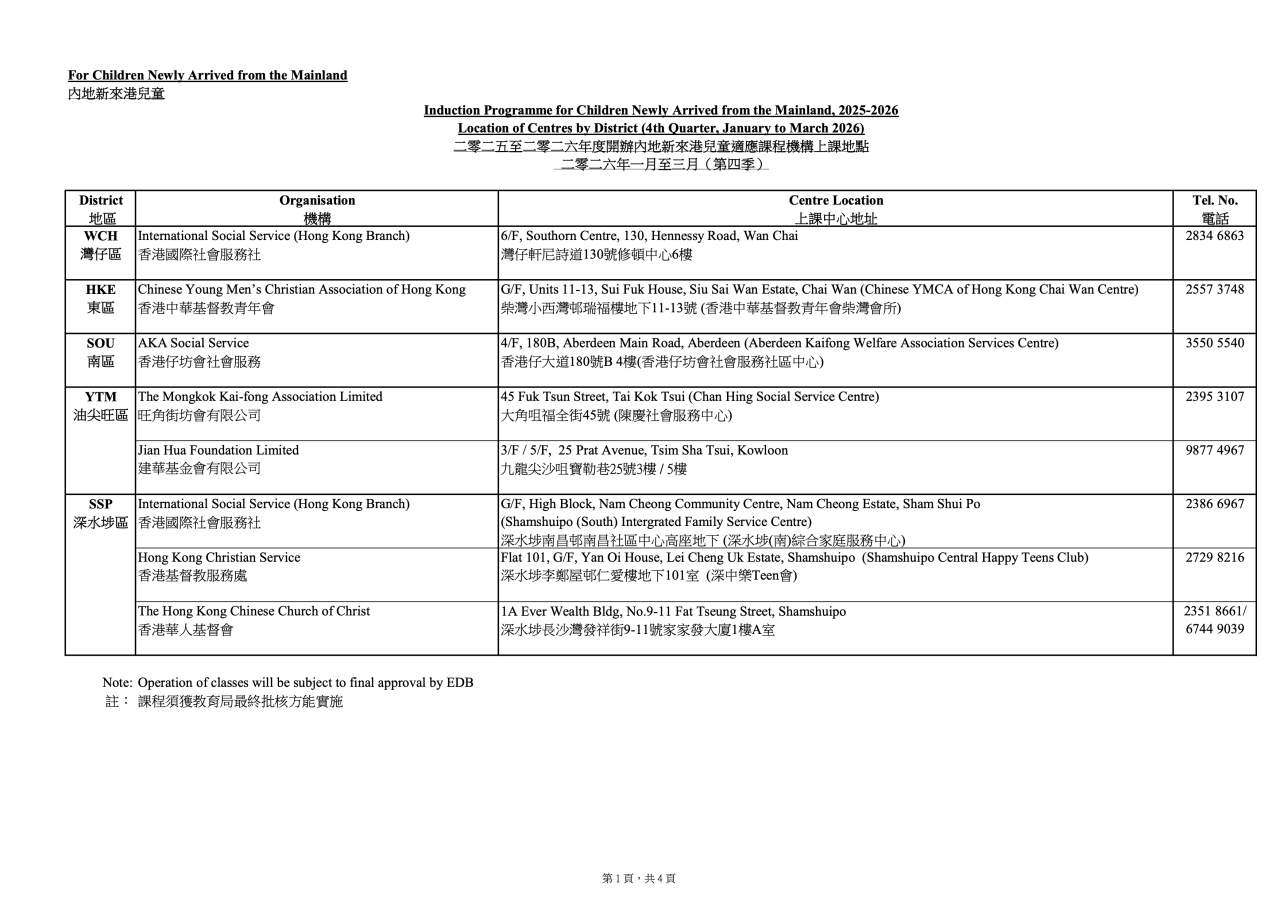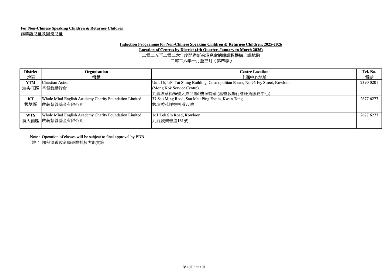新開辦適應課程機構上課地點(二零二六年一月至三月)