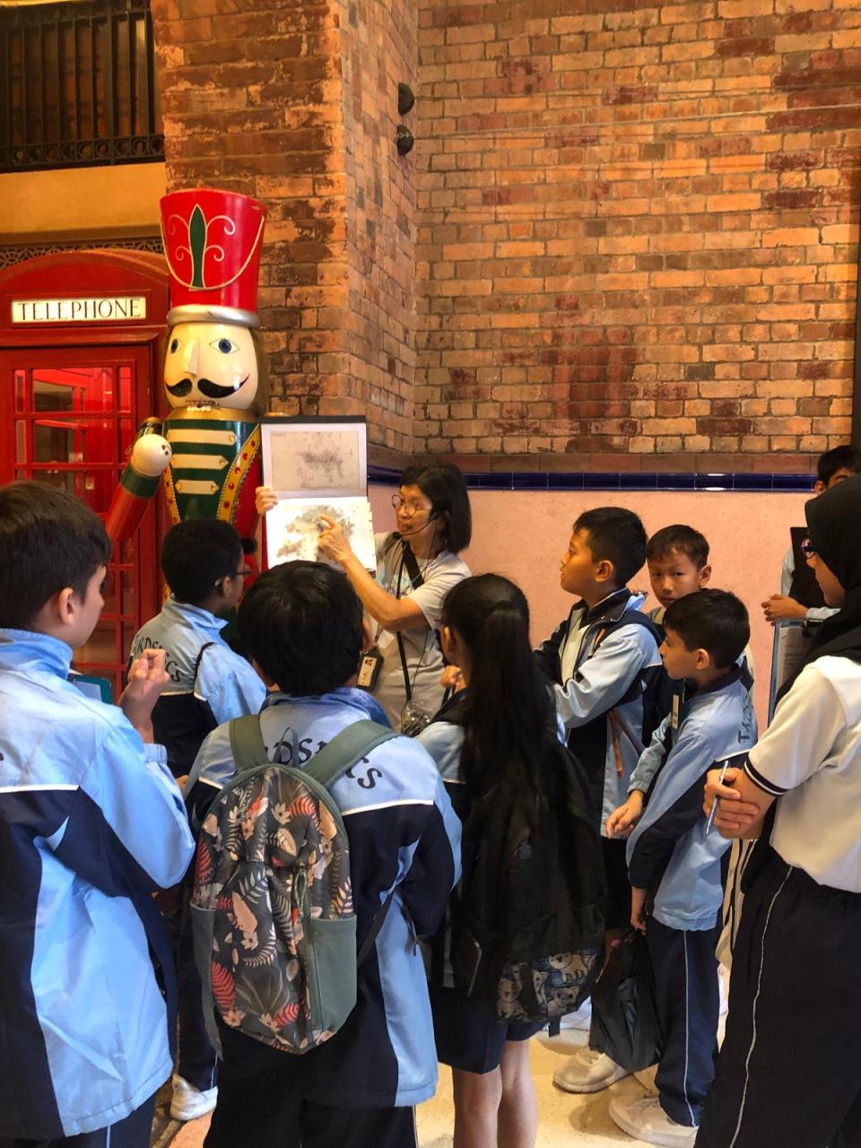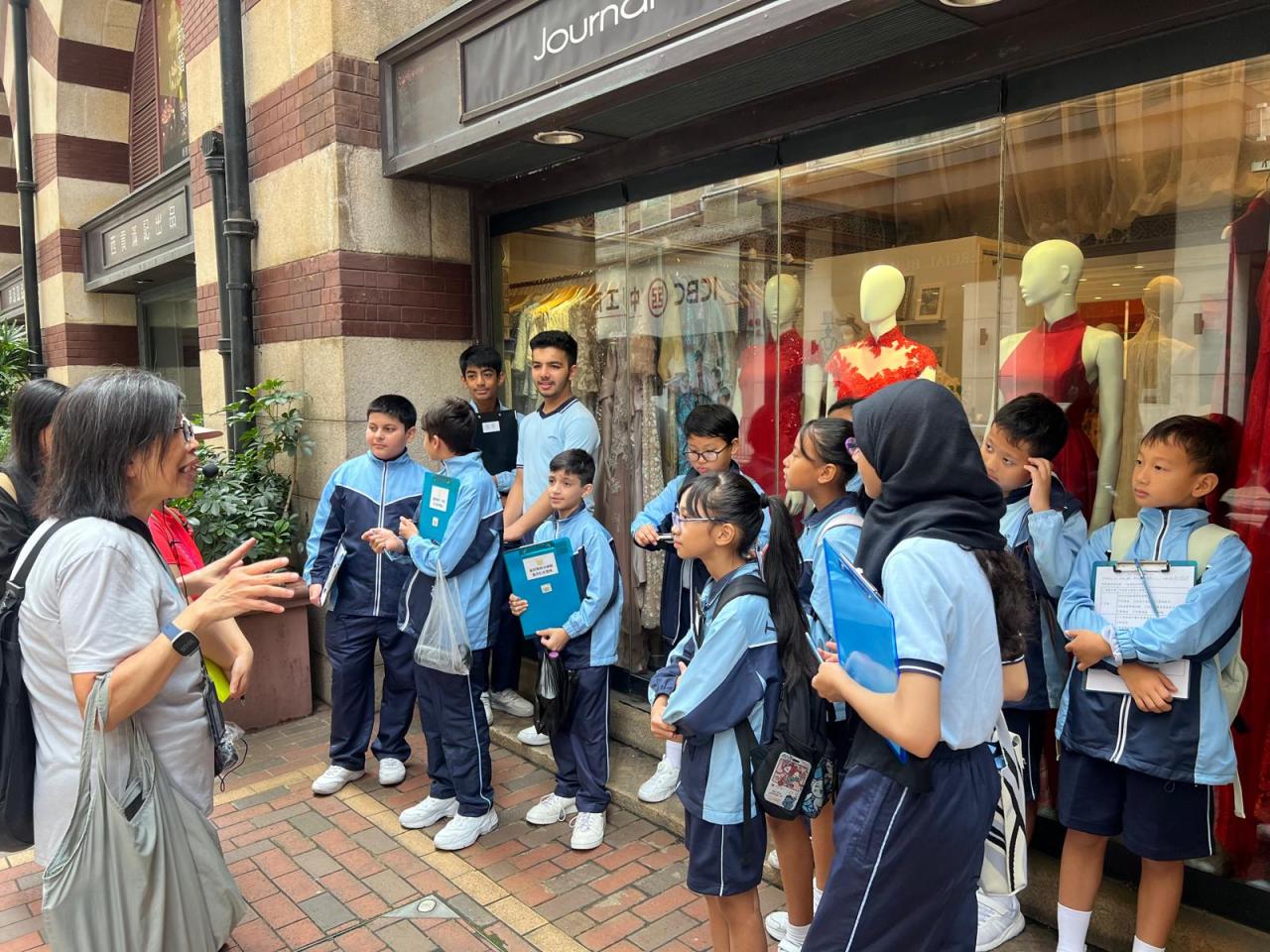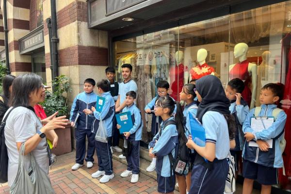 同學走出課室,來到中西區文物徑,上一節「不一樣的中文課堂」,實地參觀中文課本上提及的建築物。