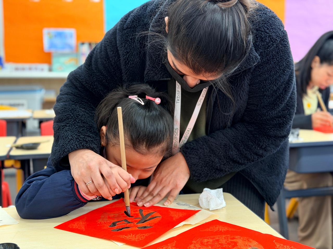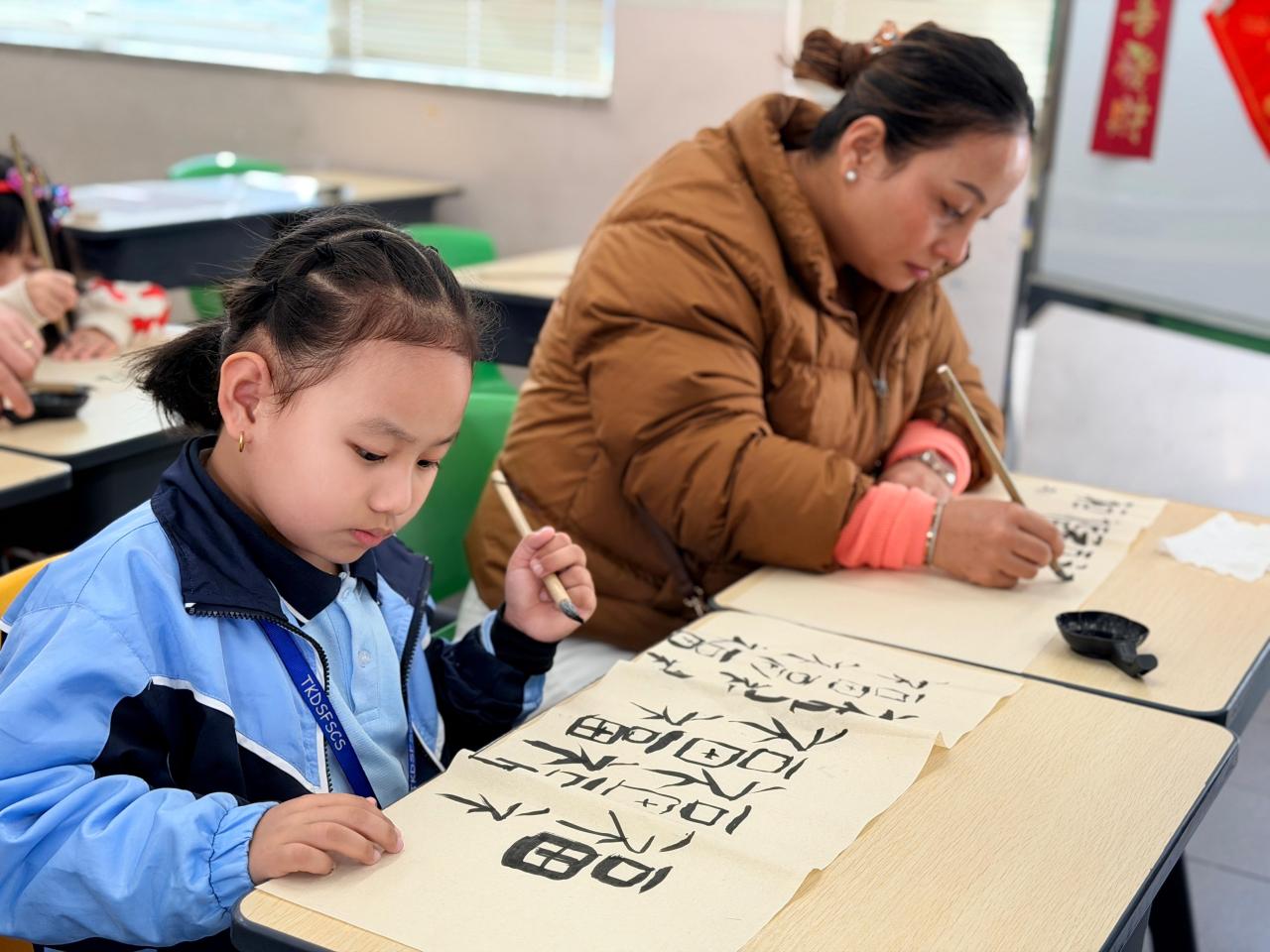 As the Lunar New Year approaches, our school held a special Chinese Brush Calligraphy Parent-Child Workshop on January 17, inviting P1 non-Chinese speaking parents and students to take part. Together, they experienced the unique charm of Chinese calligraphy and personally created festive Fai Chun scrolls, immersing themselves in the joy of traditional culture.