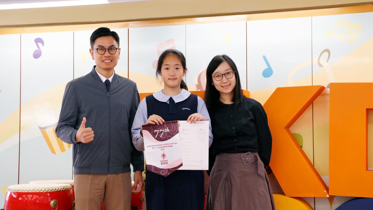 本校 6D 林彥君同學在第七十七屆香港學校朗誦節 小學五、六年級女子組詩詞獨誦(普通話) 中,勇奪冠軍 !恭喜林彥君同學!感謝老師悉心指導!