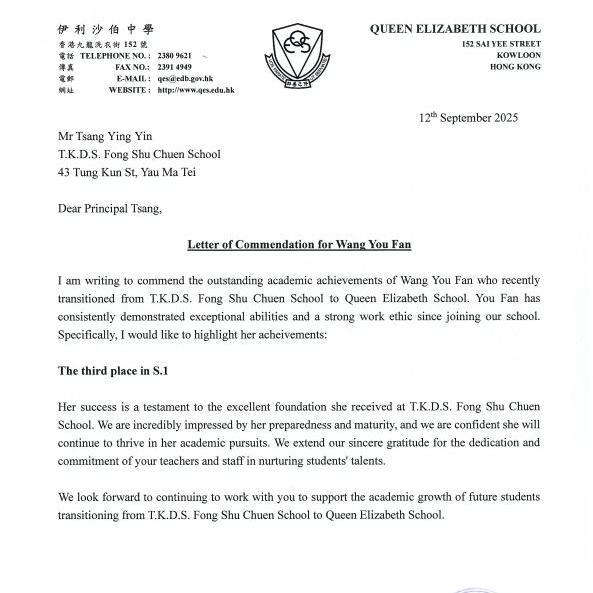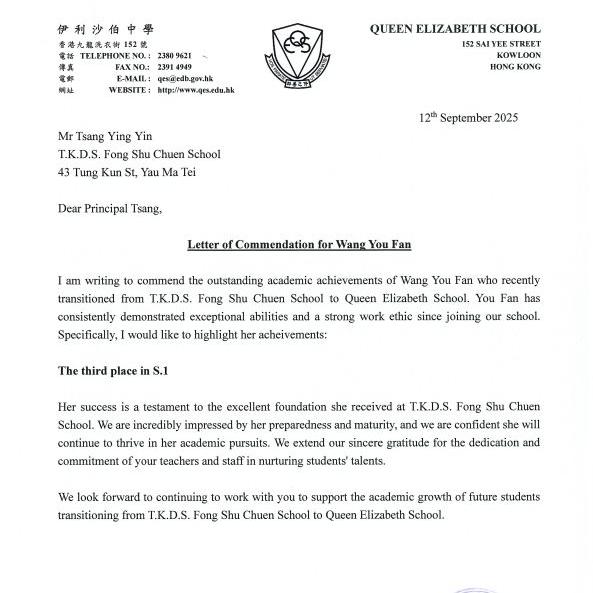 We are pleased to share that our school has recently received letters from various secondary schools highlighting the impressive academic performance of our graduates. Among them, Wang You Fan achieved an outstanding result—3rd place in Form 1 at Queen Elizabeth School.