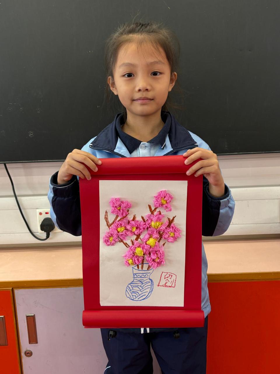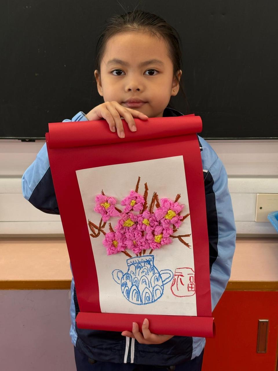 一年級「桃花賀新春」:桃花盛放,寓意喜氣洋洋,象徵新春的美好祝福。