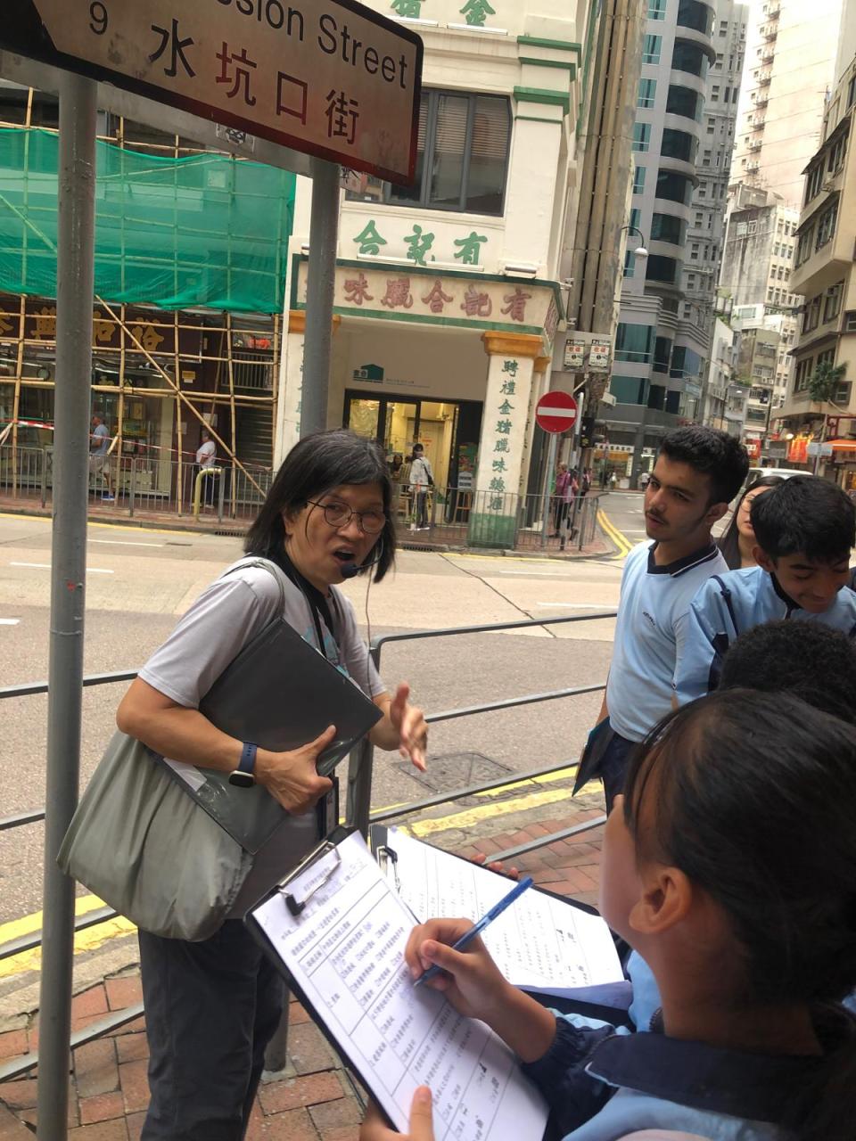同學走出課室,來到中西區文物徑,上一節「不一樣的中文課堂」,實地參觀中文課本上提及的建築物。